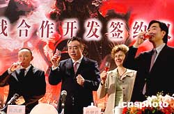 四月十八日,電影版網(wǎng)絡(luò)游戲《無極》在北京舉辦了新聞發(fā)布會.由派格無極數(shù)字文化環(huán)球傳媒公司與法國軟件開發(fā)商育碧公司聯(lián)手開發(fā),以中國電影導(dǎo)演陳凱歌的作品《無極》為主題的網(wǎng)絡(luò)游戲,將正式在國內(nèi)開發(fā)該款游戲產(chǎn)品.據(jù)悉,這是中國電影界首次開發(fā)電影網(wǎng)絡(luò)游戲。圖為陳凱歌(左二)與主辦方開香檳慶祝。作者:韓藝冰