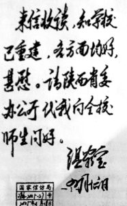 面對(duì)取得的這些成績,吝王小學(xué)的師生們想到了當(dāng)年溫總理的關(guān)懷和勉勵(lì),就寫信讓總理放心。3月30日,這封寄托著全校師生情感的普通信件從華縣郵局寄往北京。4月16日,總理看到信件的當(dāng)天就做了批示:“來信收讀,知學(xué)校已重建,各方面均好,甚慰。請(qǐng)陜西省委辦公廳代我向全校師生問好。溫家寶四月十六日”。