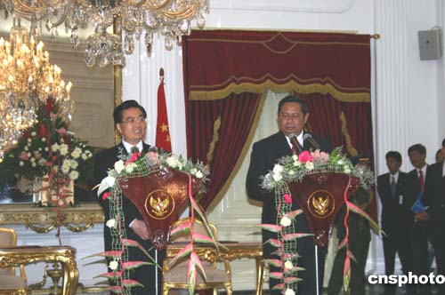 中新網雅加達四月二十五日電(記者李靜)中國國家主席胡錦濤二十五日在雅加達與印尼總統(tǒng)蘇希洛舉行會談。雙方共同簽署《聯合宣言》,宣布建立中國與印尼戰(zhàn)略伙伴關系。