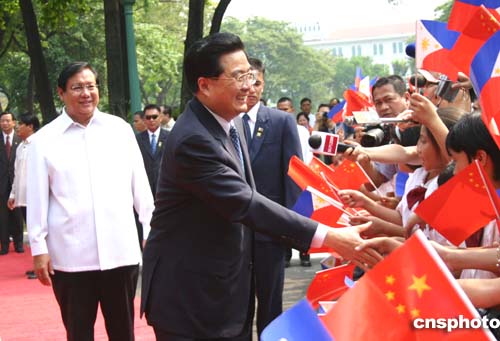 正在菲律賓進(jìn)行國事訪問的中國國家主席胡錦濤,四月二十七日與菲律賓總統(tǒng)阿羅約舉行會談。圖為胡錦濤主席在菲總統(tǒng)府內(nèi)受到熱烈歡迎時,主動上前與歡迎的小學(xué)生親切握手。作者:李靜