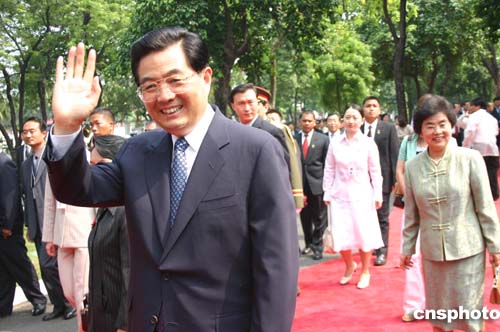 正在菲律賓進行國事訪問的中國國家主席胡錦濤,四月二十七日與菲律賓總統(tǒng)阿羅約舉行會談,并共同出席了雙方多項合作協(xié)議的簽字儀式。圖為胡錦濤主席在阿羅約總統(tǒng)舉行的歡迎儀式上。作者:李靜