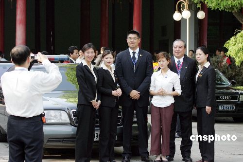 連戰(zhàn)的長(zhǎng)子連勝文(右四)四月二十七日在南京參觀(guān)中國(guó)近代史遺址博物館時(shí),與臺(tái)灣著名藝人、亞洲影帝柯俊雄(右二)以及當(dāng)?shù)氐膶?dǎo)游小姐們一起合影。作者:毛建軍