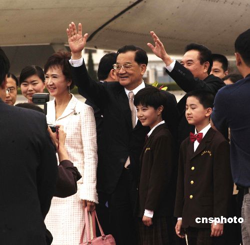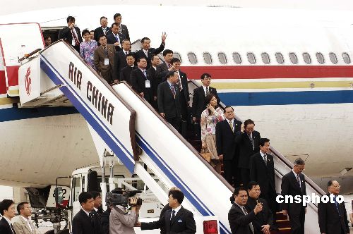 中共中央臺(tái)辦主任陳云林、中共北京市委副書記龍新民、在京臺(tái)商代表和北京各界代表列隊(duì)在停機(jī)坪熱烈歡迎連戰(zhàn)一行。