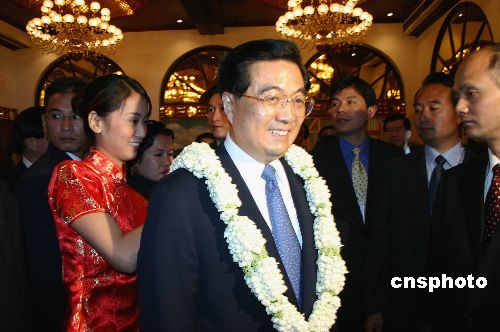四月二十八日,中國國家主席胡錦濤在馬尼拉出席菲律賓華人各界歡迎會,接受華人敬獻(xiàn)的茉莉花環(huán)。作者:李靜