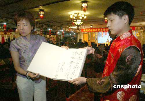 為了迎接這位“鄰家大哥”,老舍茶館的服務員分別穿上了只有在重大節(jié)日才穿的大褂和旗袍。茶館總經理尹智君說,茶館是以辦喜事的心情來迎接連戰(zhàn)大哥及其率領的訪問團,我們希望他到這里就象到了家似的。環(huán)顧茶館三樓演出大廳,木質的廊窗,精雕細制中不失大家氣度,高掛的各式大紅的宮燈,褐色的硬木八仙桌。金色椅墊的背靠椅,黃白花紋的細磁蓋碗都透著濃郁的京味。