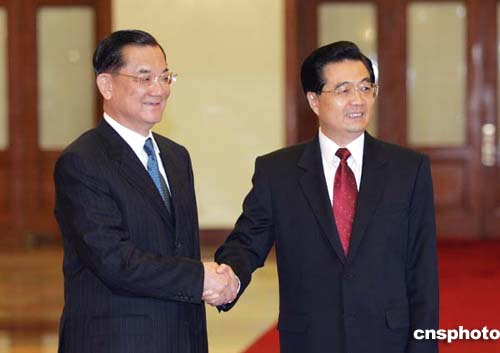 中共中央總書記胡錦濤在北京人民大會堂與中國國民黨主席連戰(zhàn)會面,實現(xiàn)了兩黨最高領(lǐng)導(dǎo)人相隔60年后的歷史性握手。