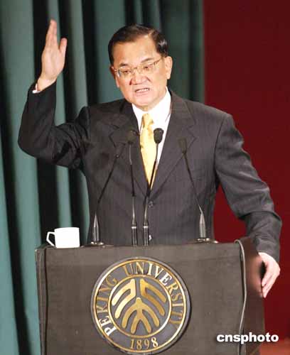 連戰(zhàn)在熱烈的掌聲中開始了他長達(dá)一個(gè)多小時(shí)的演講和答問,期間贏得了二十五次熱烈的掌聲。連戰(zhàn)以他的母親是北大學(xué)友為開場白,一下拉近了他與北大師生的距離。連戰(zhàn)說“臺(tái)灣的媒體說我今天回‘母’校——母親的學(xué)校,這是一個(gè)非常正確的報(bào)道!边@一幽默的開場白贏得了全場的掌聲和笑聲。