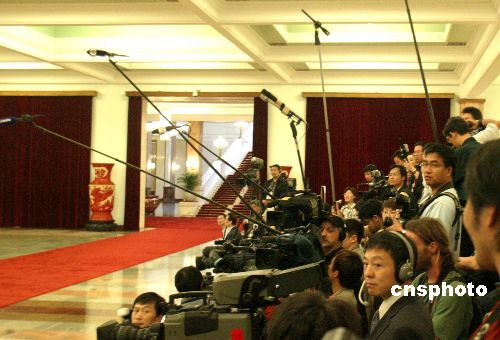 四月二十九日下午,中共中央總書(shū)記胡錦濤在北京會(huì)見(jiàn)中國(guó)國(guó)民黨主席連戰(zhàn)。大批海內(nèi)外媒體記者云集人民大會(huì)堂見(jiàn)證這一歷史時(shí)刻。作者:廖文靜
