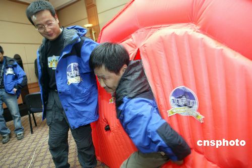 四月二十一日,由北京三夫戶外運(yùn)動俱樂部發(fā)起并成立、聯(lián)想集團(tuán)公司冠名贊助的一支民間科學(xué)考察隊(duì)伍-聯(lián)想鋒行科學(xué)考察探險隊(duì)在北京正式成立,將于今年五月份對可可西里(藏北、新疆阿爾金山區(qū)域)進(jìn)行由南至北的穿越式科學(xué)考察活動,最重要的科考內(nèi)容是與北京大學(xué)環(huán)境學(xué)院聯(lián)合進(jìn)行的“青藏高原可可西里地區(qū)表土POPs分布調(diào)查”項(xiàng)目,這項(xiàng)科考內(nèi)容在中國還是第一次。本次科考探險活動將從五月一日開始,歷時二十二天,行程六千多公里,其中穿越無人區(qū)達(dá)一千六百多公里。圖為科考探險隊(duì)隊(duì)員演示一個酷似帳篷的便攜式高壓氧艙。作者:盛佳鵬