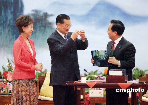 中共陜西省委書(shū)記李建國(guó)四月三十日晚在西安會(huì)見(jiàn)并宴請(qǐng)中國(guó)國(guó)民黨主席連戰(zhàn)和他率領(lǐng)的大陸訪(fǎng)問(wèn)團(tuán)成員。圖為連戰(zhàn)向李建國(guó)回贈(zèng)禮物。作者:毛建軍