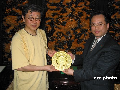 到五月一日中午十二點整,愛知世博會中國館觀眾突破一百萬人次,成為此次世博會開展以來除東道主之外接待參觀者最多的國家展館。圖為來自日本橫濱的公司職員近藤英男(圖左),從愛知世博會中國館館長孫鋼(圖右)手里接過一面紀(jì)念金盤,他幸運地成為中國館自三月二十五日開館以來接待的第一百萬觀眾。作者:王健