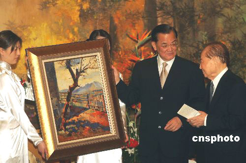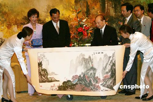 會(huì)見(jiàn)中,汪會(huì)長(zhǎng)向連戰(zhàn)主席贈(zèng)送了北京一位九十多歲的名畫(huà)家秦云嶺所畫(huà)的《江山如畫(huà)》及一九八三年與一九九六年在大陸出版的連老先生兩本著作;連主席轉(zhuǎn)交了辜振甫夫人的一封信給汪會(huì)長(zhǎng),并向他贈(zèng)送了辜先生年青時(shí)代居住陽(yáng)明山俯瞰紗帽山所創(chuàng)作的一幅油畫(huà)的復(fù)制品、臺(tái)灣琉璃名家王俠軍作品《宏圖》以及祖父連橫先生名作《臺(tái)灣通史》與他個(gè)人著作《改變,才有希望》。