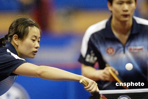 五月二日,在上海體育館舉行的第四十八屆世界乒乓球錦標(biāo)賽進(jìn)入了第三天,混雙首場大戰(zhàn)全面打響,中國香港選手梁柱恩、桑亞嬋在比賽中戰(zhàn)勝韓國選手晉級第二輪比賽。圖為梁柱恩、桑亞嬋在比賽中。作者:盛佳鵬