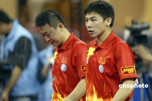 五月四日,在上海體育館進行的第四十八屆世界乒乓球錦標賽男雙半決賽中,雅典奧運會冠軍馬琳、陳玘以一比四不敵德國新搭檔蘇斯、波爾,無緣決賽。這也使中國選手提前獲得男雙冠軍的希望落空。圖為馬琳(左)、陳玘黯然離開賽場。 作者:盛佳鵬
