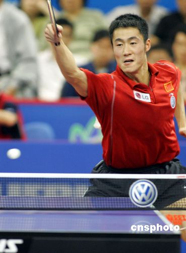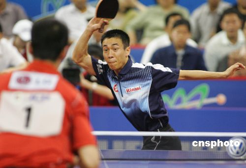 第四十八屆世乒賽男單比賽五月四日在上海體育館進行,中國選手王勵勤以四比三險勝中國香港選手李靜晉級男單八強。作者:湯彥俊