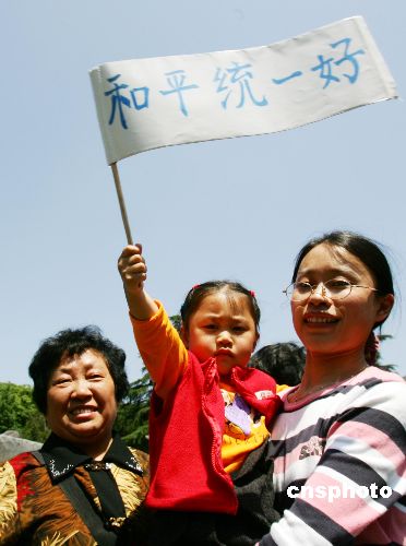 5月7日,一位小游客舉著“和平統(tǒng)一好”的字幅,歡迎親民黨主席宋楚瑜的到來(lái)。當(dāng)日上午,親民黨主席宋楚瑜率領(lǐng)親民黨大陸訪問(wèn)團(tuán)拜謁南京中山陵。作者:郎從柳