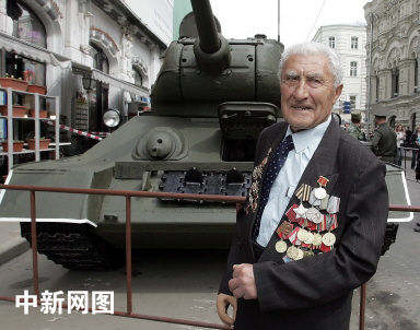 近日,在莫斯科紅場(chǎng)為紀(jì)念衛(wèi)國(guó)戰(zhàn)爭(zhēng)勝利慶典展出了二戰(zhàn)時(shí)的坦克模型,圖為二戰(zhàn)老兵與二戰(zhàn)時(shí)的坦克合影。