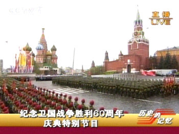 5月9日,俄羅斯在莫斯科紅場(chǎng)舉行紀(jì)念衛(wèi)國(guó)戰(zhàn)爭(zhēng)勝利60周年慶典。(央視截圖)