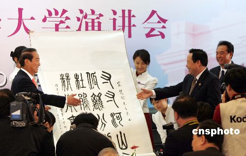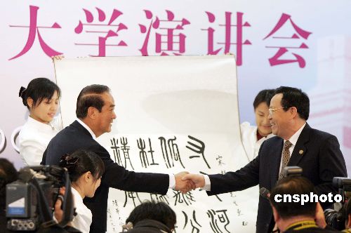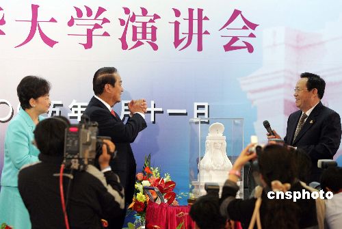五月十一日上午,親民黨主席宋楚瑜在清華大學(xué)發(fā)表演講,并回答學(xué)生們的提問。演講后,清華大學(xué)校長(zhǎng)顧秉林向宋楚瑜贈(zèng)送禮物。作者:毛建軍