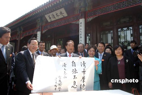 五月十一日上午,親民黨主席宋楚瑜在清華大學(xué)發(fā)表演講,演講結(jié)束后,親民黨主席宋楚瑜率親民黨大陸訪問團(tuán)清華大學(xué)的主要景點(diǎn)和經(jīng)典建筑并題寫“清華厚德自強(qiáng)不息”。作者:張勤