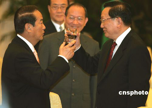 五月十一日晚,中共中央政治局常委曾慶紅在北京人民大會堂宴請親民黨主席宋楚瑜一行,宋楚瑜致詞后向出席宴會的國務(wù)委員唐家璇敬酒。作者:任晨鳴