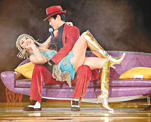 之后秋官站在一個離地約十多呎的凌空舞臺上唱歌,為安全起見,他全程扶實欄桿,接著雯女亦以金色如妃Look出現(xiàn),但兩人的頭飾一度勾住,秋官即搞笑說:“如妃一出就勾勾搭搭,搞到臺下老百姓大叫!”雯女獨唱一曲《似是故人來》后更即場除去外面的古裝,原來內(nèi)里穿了一條低胸超短裙,十分性感,更和秋官跳辣身舞,更伸手摸秋官胸部及坐大腿。