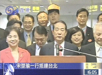 中新網(wǎng)5月13日電 親民黨主席宋楚瑜率親民黨大陸訪問團(tuán)結(jié)束9天大陸訪問行程,今天下午三點(diǎn)四十分左右乘長榮航空航班抵達(dá)臺北。臺北市長馬英九等到機(jī)場迎接。