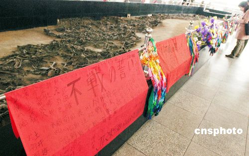 日本侵略者這種滅絕人性的殺戮行徑,令人神共憤,不僅讓中國人民刻骨銘心,也讓世界和平與正義人士義憤填膺。在“平頂山慘案紀(jì)念館”內(nèi),記者看到了許許多多來自日本的千紙鶴懸掛在遇難者遺骸的四周,這是日本“東日本鐵路工會代表團”等等那些日本和平正義人士敬獻給這些無辜遇難者冤魂的。“平頂山慘案紀(jì)念館”館長肖景全告訴記者,“平頂山慘案”遺址自上世紀(jì)七十年代開挖以來便不斷有日本游客前來參觀。三十多年來,已有數(shù)十萬人次日本人到撫順參觀“平頂山慘案”遺址紀(jì)念館。每一位目睹“慘案遺址”的參觀者,面對累累白骨,無不為當(dāng)年日軍的殘暴所震驚。(完)