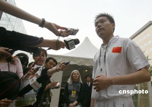 五月十五日,二○○五財富全球論壇在北京舉行體育圓桌會歡迎酒會,亞運會中國臺球神童丁俊輝參加酒會并接受媒體采訪。作者:廖文靜