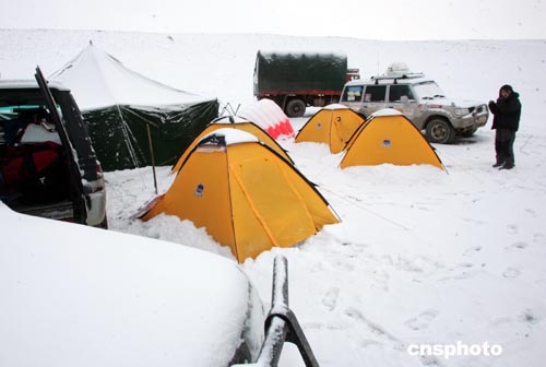 探險(xiǎn)隊(duì)野外搭起橙色帳篷 風(fēng)雪宿營(圖)