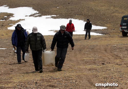 隊(duì)員野外取水并將大桶飲用水運(yùn)送上車(圖)