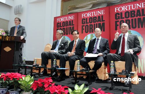2005北京《財(cái)富》全球論壇5月18日專門舉行“中國銀行業(yè)改革近況”會(huì)議,中國銀監(jiān)會(huì)主席劉明康(左三)、國家開發(fā)銀行行長陳元(右二)用嫻熟的英語坦誠地與麥肯錫公司亞洲區(qū)董事長鮑達(dá)民(左二)、安永會(huì)計(jì)師事務(wù)所合伙人羅德曼(右一)等人對話。作者:任晨鳴
