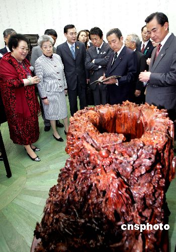 | 五月十九日,二零零五年日本愛知世屆博覽會(huì)中國(guó)館日活動(dòng)隆重舉行。中國(guó)國(guó)務(wù)院副總理吳儀(左二)出席,并與日本前首相橋本龍?zhí)?右二)等貴賓一起參觀中國(guó)館內(nèi)的紫檀齋。二零零五年日本愛知世博會(huì)中國(guó)館主題為“自然、城市、和諧--生活的藝術(shù)”,中國(guó)館的展出通過(guò)博大精深的中國(guó)文化的演繹,表達(dá)了中國(guó)人“天人合一”的哲學(xué)思想。圖為中國(guó)紫檀博物館館長(zhǎng)陳麗華(左一)向來(lái)賓介紹精湛的紫檀工藝品。作者:毛建軍