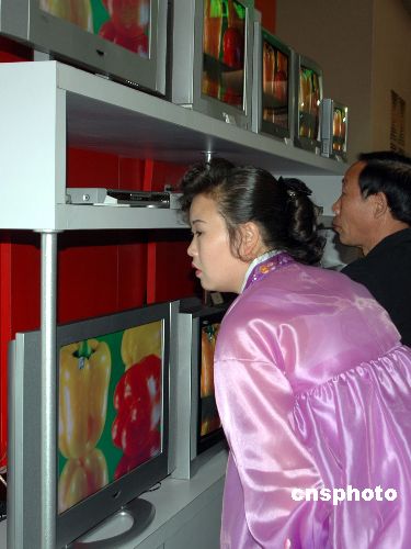 由朝鮮貿(mào)易省主辦的“第八屆平壤國際商品博覽會”五月十六日至十九日在朝鮮平壤三大革命展示館舉行,有來自世界各國的三百多家企業(yè)參展,這是朝鮮歷史上首次舉辦大規(guī)模的國際商務活動。圖為朝鮮人參觀中國生產(chǎn)的液晶電視展臺。作者:涵喬