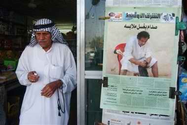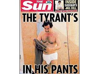 在巴格達(dá)的咖啡店,伊拉克人正在觀看一些阿拉伯衛(wèi)星電視臺(tái)播放《太陽(yáng)報(bào)》頭版刊登的照片,其中一張就是薩達(dá)姆只穿內(nèi)褲站著的照片。《太陽(yáng)報(bào)》還刊登著薩達(dá)姆在洗衣服、睡覺(jué)以及在獄中踱步等鏡頭。