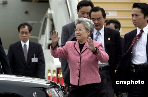 中國國務(wù)院副總理吳儀五月二十二日下午抵達(dá)東京羽田機(jī)場,繼續(xù)她的日本之行。圖為吳儀在機(jī)場向前來歡迎的當(dāng)?shù)厝A僑和留學(xué)生代表招手致意。作者:王健