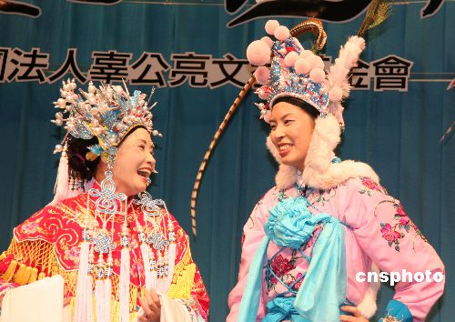 五月二十三日,由辜振甫先生創(chuàng)辦的辜公亮文教基金會在臺北宣布,兩岸京劇名家尚長榮、李寶春等將于六月三日至五日于臺北新舞臺合作多部經(jīng)典之作。圖為國民黨新聞發(fā)言人鄭麗文(右)、親民黨籍知名人士秦慧珠應邀以京劇扮相露面,一同為活動造勢。作者:許曉青