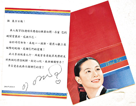 李英愛原定昨日中午十二時(shí)十五分乘車往機(jī)場,但由于她堅(jiān)持要在送贈(zèng)各大傳媒的答謝卡上簽名,因而延遲至十二時(shí)四十五分才離開酒店。薄施脂粉的“長今”,手挽LV袋,配襯牛仔褲,精神奕奕地步出酒店,當(dāng)她發(fā)現(xiàn)在場有十多名fans守候,隨即主動(dòng)走近,并為他們逐一簽名留念,才上車前往機(jī)場。