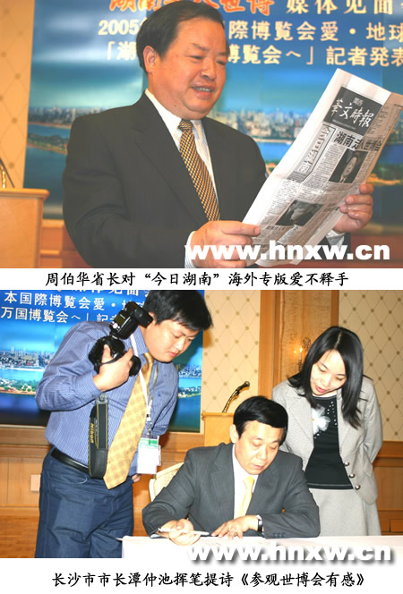 長(zhǎng)沙市市長(zhǎng)譚仲池看了“今日湖南”海外專版后,興奮地在記者招待會(huì)現(xiàn)場(chǎng)揮筆題詞“今日長(zhǎng)沙”,他希望中國(guó)新聞社湖南分社與日本《關(guān)西華文時(shí)報(bào)》今后能夠在日本加強(qiáng)宣傳長(zhǎng)沙,同時(shí)揮筆寫了一首“參觀世博會(huì)有感”的詩(shī):“愛知世博花繽紛,自然人類共文明;滿月燦爛話未來(lái),和平發(fā)展有智慧。”