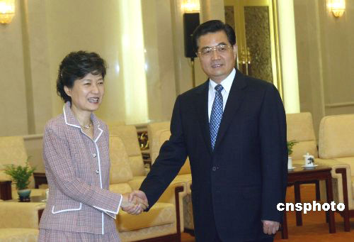 中新網(wǎng)5月24日電 中共中央總書記、國(guó)家主席胡錦濤24日下午在人民大會(huì)堂會(huì)見了韓國(guó)大國(guó)家黨代表(黨首)樸槿惠,賓主進(jìn)行了友好談話。
