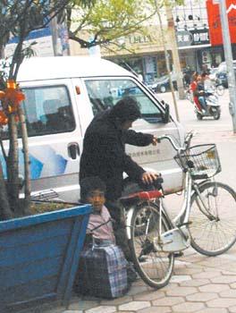 一邊等待,這個“乞兒”一邊將自己的要錢罐、滑輪車放進(jìn)了一個編織袋內(nèi)。沒了滑輪車,他怎么走?就在記者疑惑時,中午給“乞兒”送肉包子的那個男子騎著一輛自行車來了。看到“乞兒”遞上的大把錢幣,他滿意地向“乞兒”點(diǎn)點(diǎn)頭,然后將“乞兒”抱上自行車后貨架,離開了。