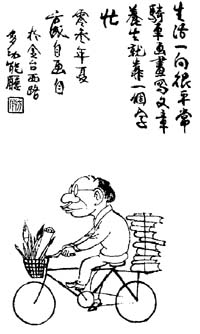著名漫畫家方成有一幅“自畫自”的漫畫:一個大腦袋的方成,騎著一輛自行車,背后馱著一摞書,前面車筐里,插著幾支筆一卷畫。上題三句話:“生活一向很平常,騎車畫畫寫文章,養(yǎng)生就靠一個字,忙!边@是他對自己的生存狀態(tài)的自我描繪,走近他始知其言不虛。
