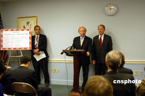 | 美國參議員喬.利伯曼(講話者)和拉馬爾.亞歷山大(前右一)二十五日聯(lián)合提出一項(xiàng)議案,要求美國聯(lián)邦政府從二00六年到二0一一年的五個(gè)財(cái)政年度內(nèi)撥款十三億美元,全面促進(jìn)美中在教育、學(xué)術(shù)、商業(yè)等方面的交流與接觸,并在美國中小學(xué)加強(qiáng)中文教育。作者:余東暉