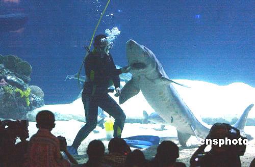 五月二十六日,觀察科研人員在水下對中華鱘投喂鯽魚。從第一尾國寶級中華鱘進(jìn)入北京海洋館至今,二十六尾中華鱘已經(jīng)完全適應(yīng)人工喂養(yǎng)。作者:韓藝冰