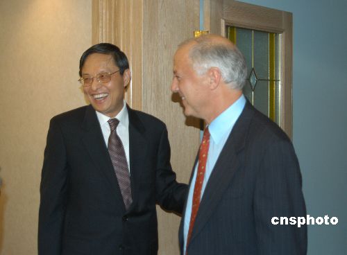圖:周文重與新任美中關(guān)系全國委員會主席交談