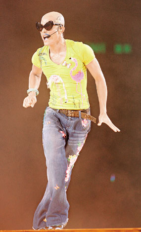 中新網(wǎng)6月1日電 據(jù)香港媒體報道,郭富城(城城)的神秘演唱會舞臺造型,在昨晚的“郭富城舞臺寶典@飛越舞林演唱會2005二部曲”揭曉,原來城城鏟了一個光頭,而且頭部畫了一只小鳥。城城這個突破性造型,令全場觀眾尖叫達數(shù)分鐘之多,極為震撼。