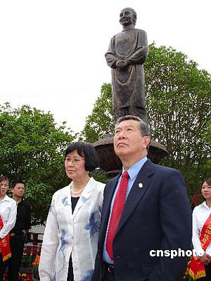 在如皋市委書記陳惠娟、市長周鐵根等陪同下,李昌鈺和夫人來到如皋市如城城西村的東方大壽星園,他的母親李王岸佛的銅塑就落成在這里。