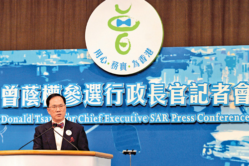 他透過面前密集的媒體大陣仗,向香港市民正式宣布參加中華人民共和國香港特別行政區(qū)行政長官選舉,同時公布他的施政綱領(lǐng)。
