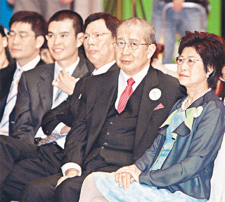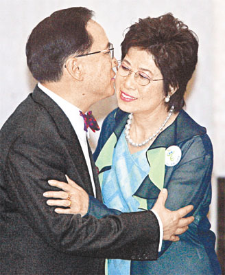 當(dāng)曾蔭權(quán)走下講臺時,立刻與迎上前去的太太鮑笑薇擁抱。此時,他的競選助手們正向媒體散發(fā)內(nèi)涵含講詞和政綱的彩色講義冊,開啟處被設(shè)計成上方有一藍(lán)色煲呔的淡綠西裝樣式。而冊子的背后,則是曾太寫有施政理念“強(qiáng)政勵治,締造和諧,福為民開”的十二字書法,抬首處是一枚篆刻小章“自強(qiáng)不息”。(完)