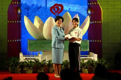陳至立向來自北京和京外奧運會賽區(qū)城市的志愿者代表授北京奧運會志愿者旗幟。